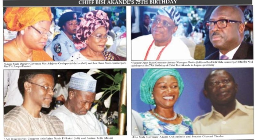 It was a glorious day for the Interim Chairman of the All Progressives Congress (APC), Chief Bisi Akande as party chieftains across the country converged on Eko Hotel, Victoria Island, Lagos, yesterday to celebrate his 75th birthday.